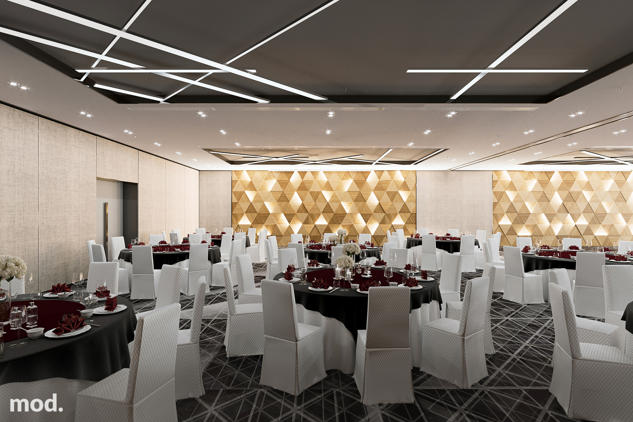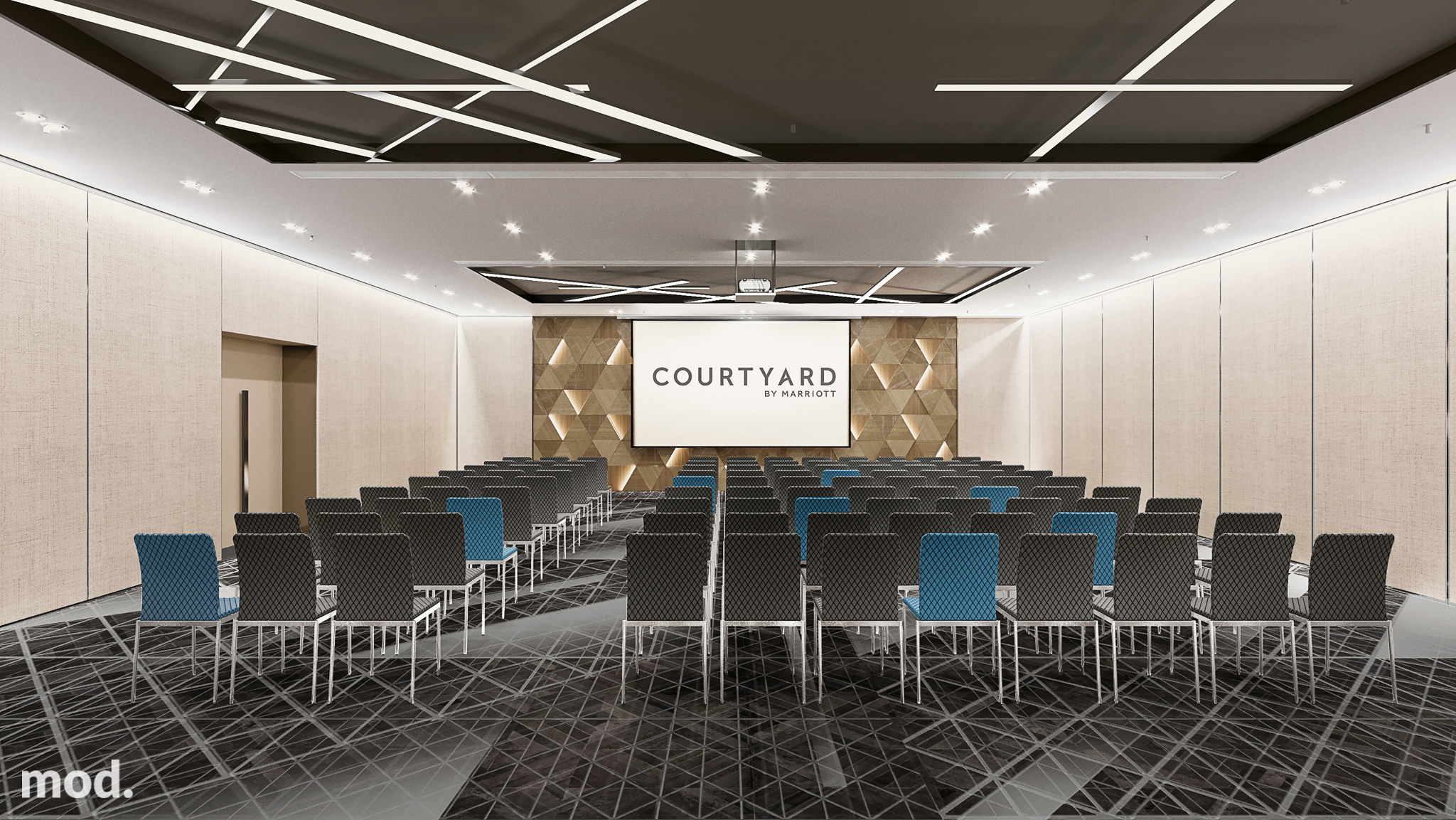 Interior Design of Courtyard by Marriott conference center in the Posejdon Center facility. Mod Architecture was also responsible for the executive project of all 255 rooms, public spaces of two brands Courtyard by Marriott and Moxy Hotels in Posejdon Center – Szczecin.